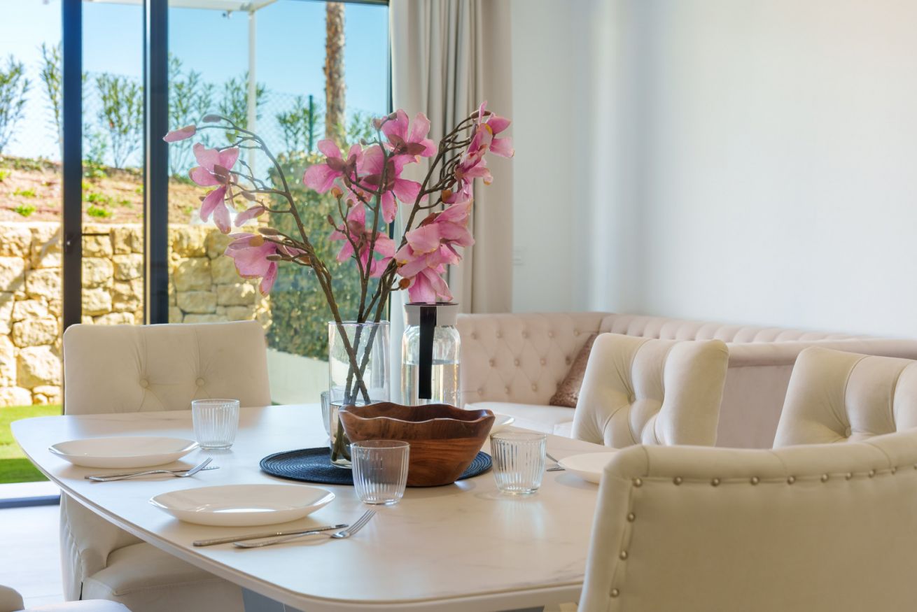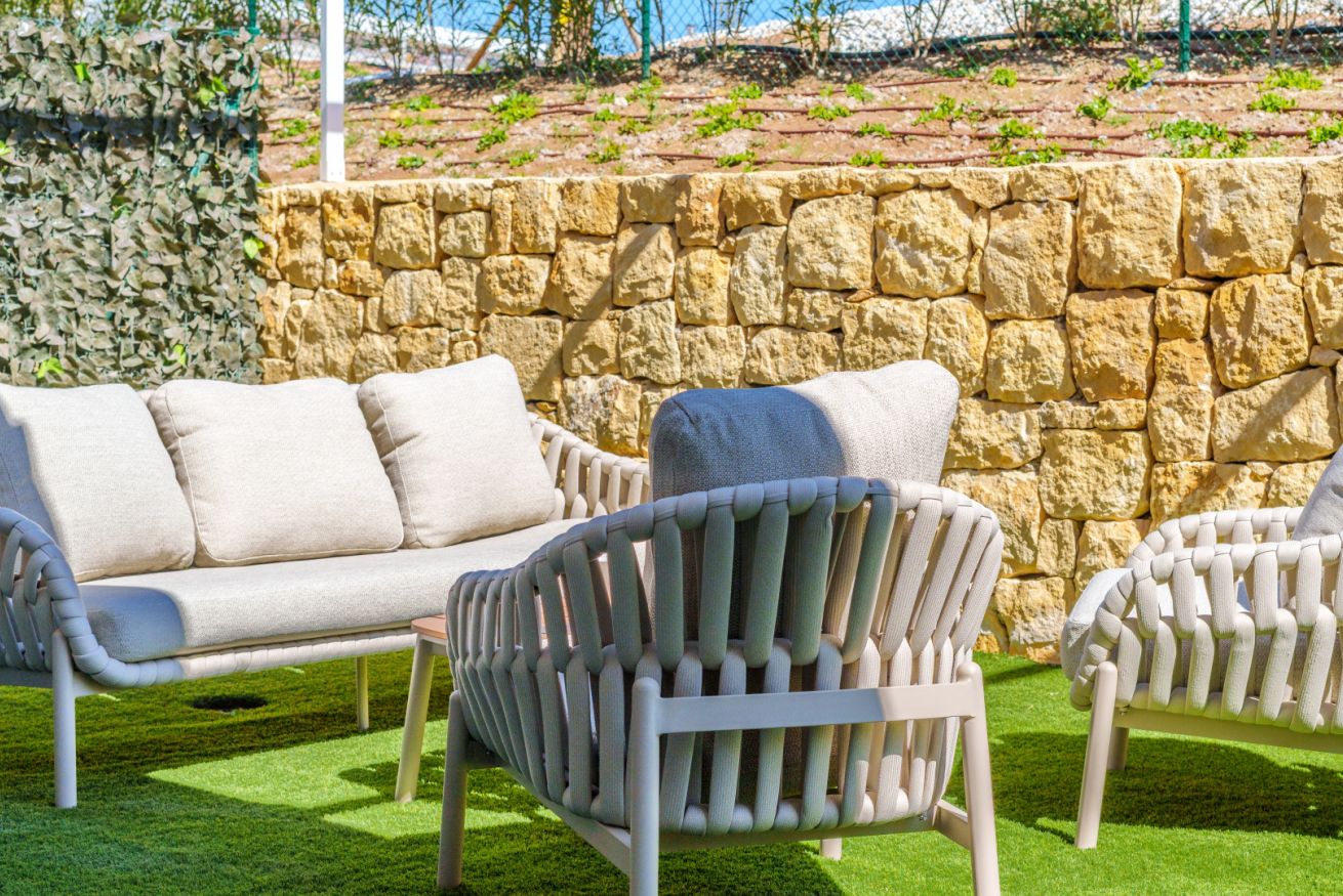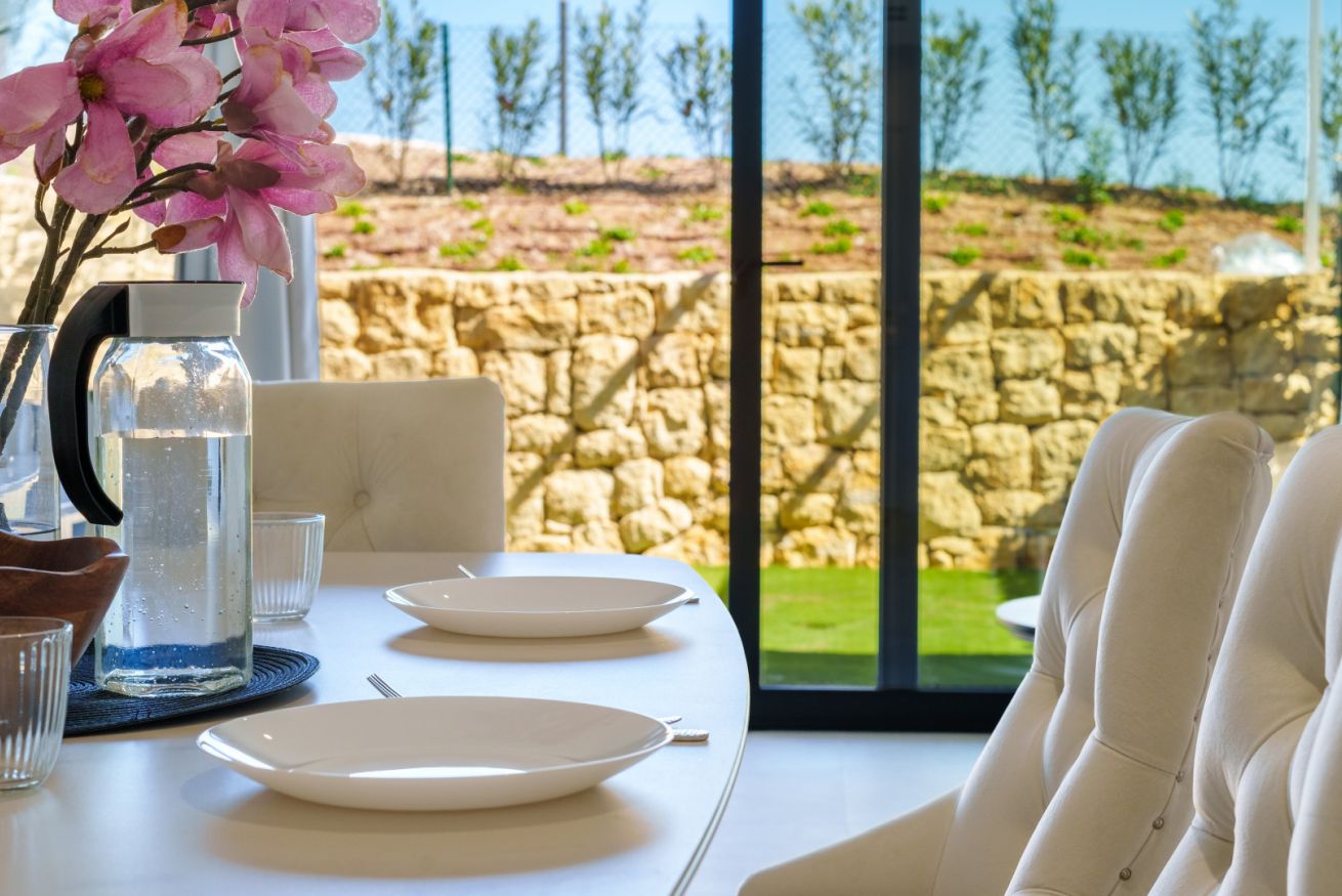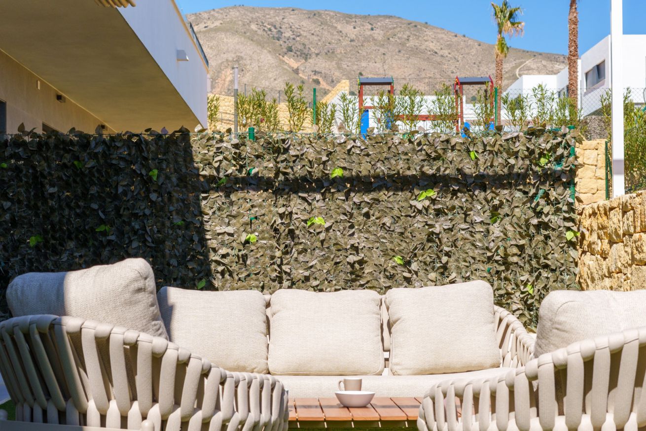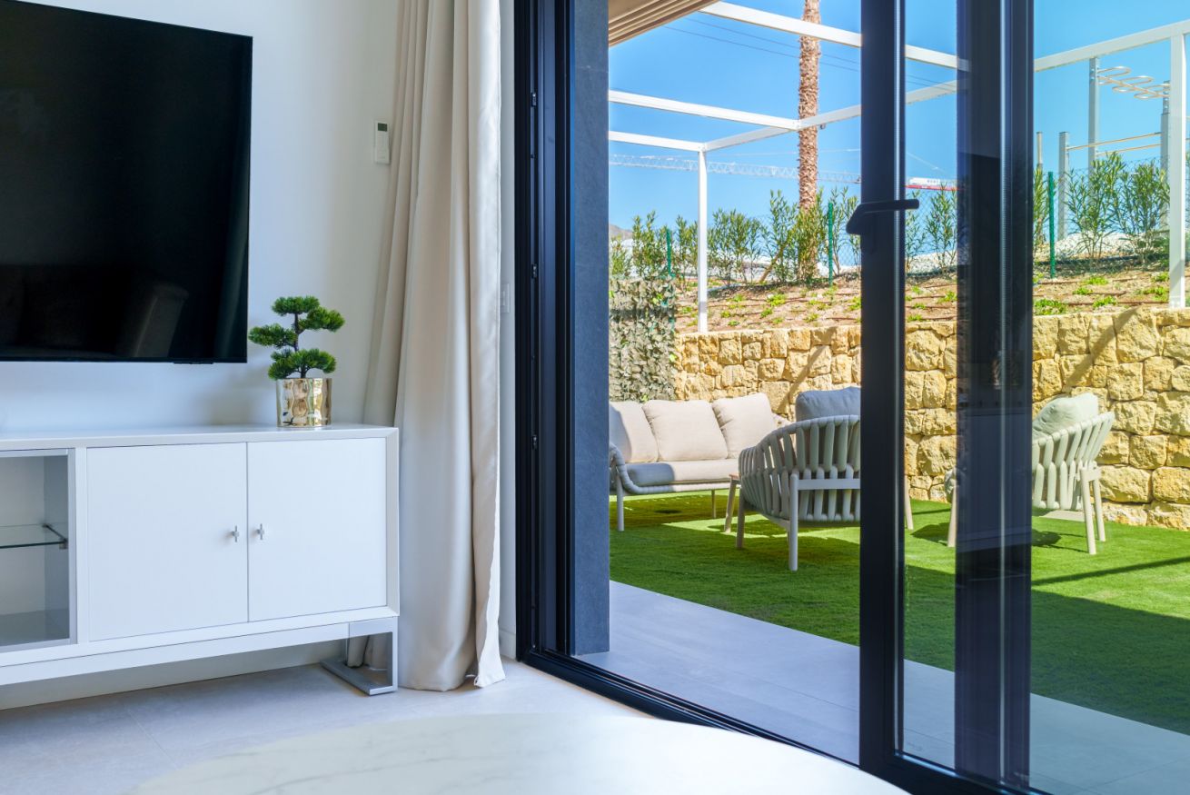 El corazón de la casa es el salón. Está creado para momentos de comunicación sincera y descanso profundo. Desde aquí, el espacio se impregna del aliento salino del mar, mientras que por las tardes el cielo sobre Finestrat se transforma en un lienzo vivo, teñido de tonos oro fundido y rosa empolvado. Es el momento de la auténtica magia del atardecer mediterráneo.