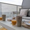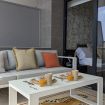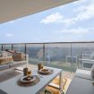 Desde la terraza, podrás contemplar la maravillosa piscina del complejo, que, con su diseño moderno y elegante, se convierte en una extensión de tu espacio privado. Aquí, la sensación de estar en un oasis se intensifica, con el azul del agua reflejando el cielo mediterráneo y la suave brisa marina acariciando tu piel.