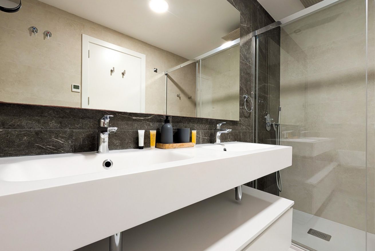 Las dos habitaciones son templos del descanso. La principal, con cama doble, baño en suite y acceso directo a la terraza, te envuelve en una atmósfera de paz y sofisticación. La segunda, con dos camas individuales, es perfecta para compartir momentos con familia o amigos, sin renunciar a la comodidad. Los baños, revestidos en materiales nobles, ofrecen duchas tipo lluvia que acarician la piel y detalles que elevan cada instante al nivel de un spa.