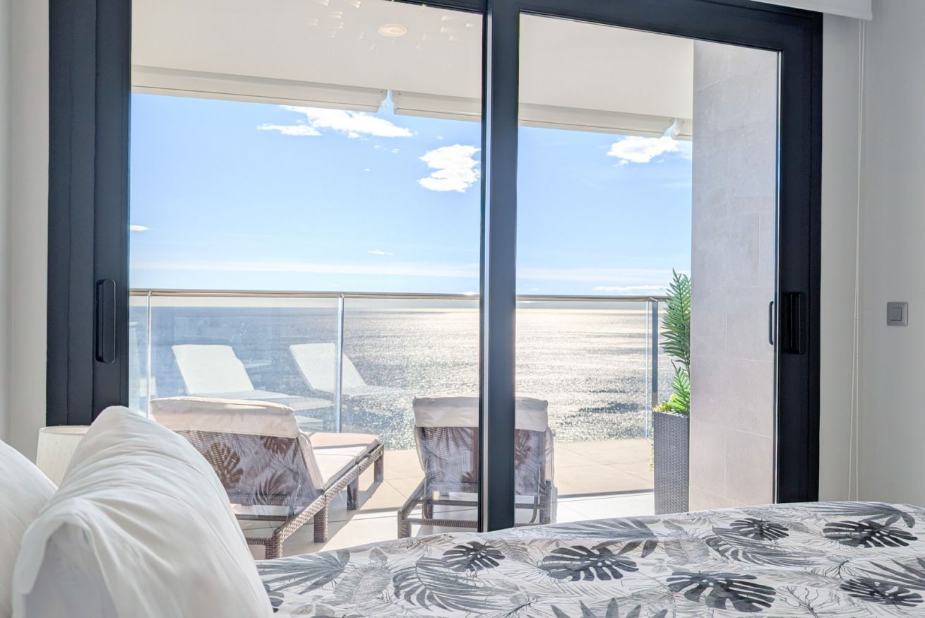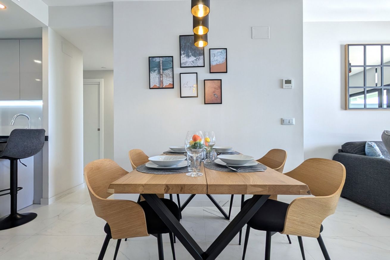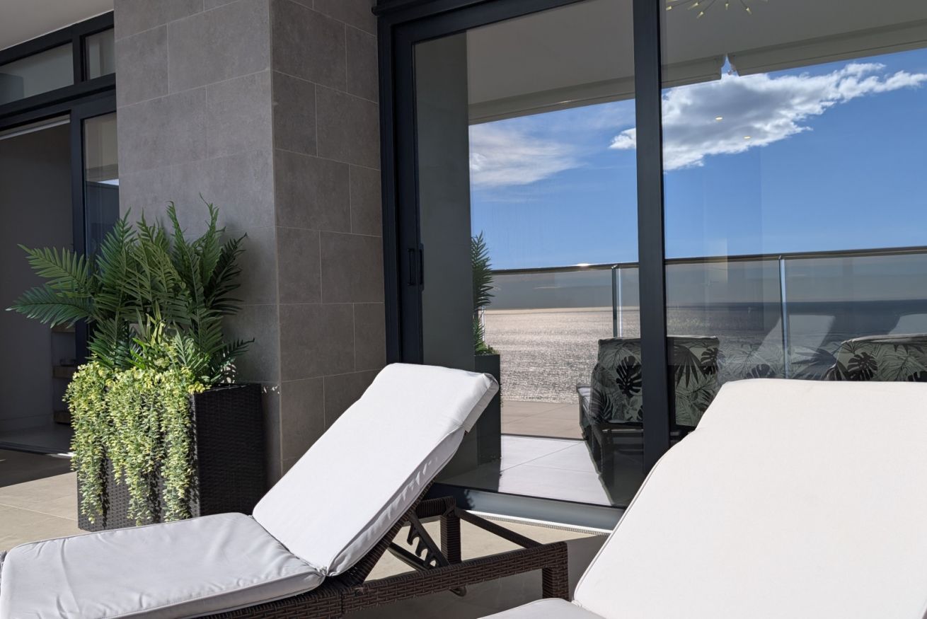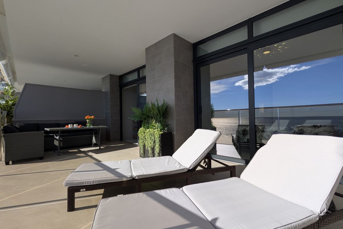 El salón es un abrazo cálido. Amplio, luminoso, con un sofá que te invita a hundirte en él y dejar que el tiempo se detenga. La Smart TV espera tus películas favoritas, mientras los ventanales de suelo a techo inundan el espacio con la luz dorada del Mediterráneo. Y justo al lado, la terraza…un balcón al paraíso, donde el mar se convierte en tu vecino y el cielo en tu techo. Desayunar aquí es como hacerlo en una postal, y cada atardecer es una pintura viva que se despliega solo para ti.