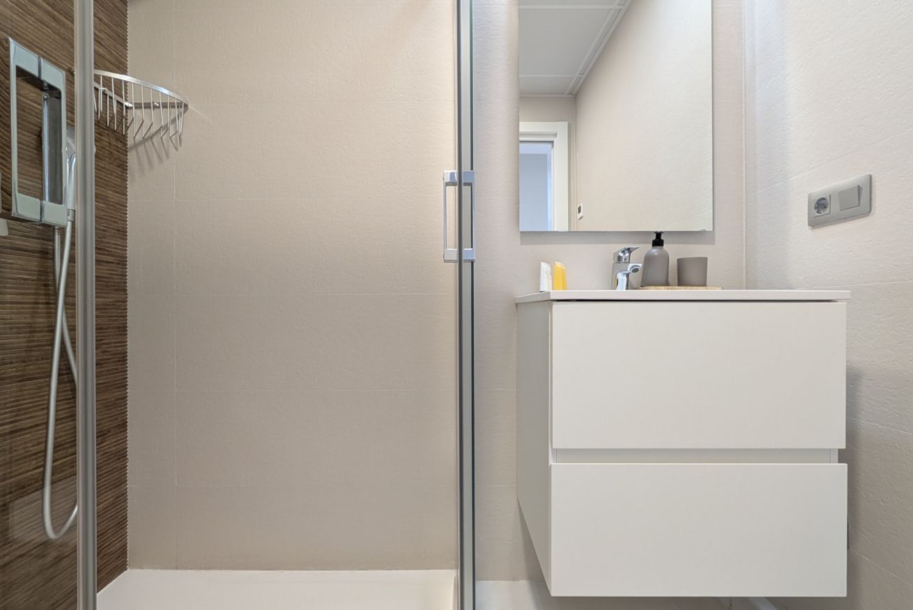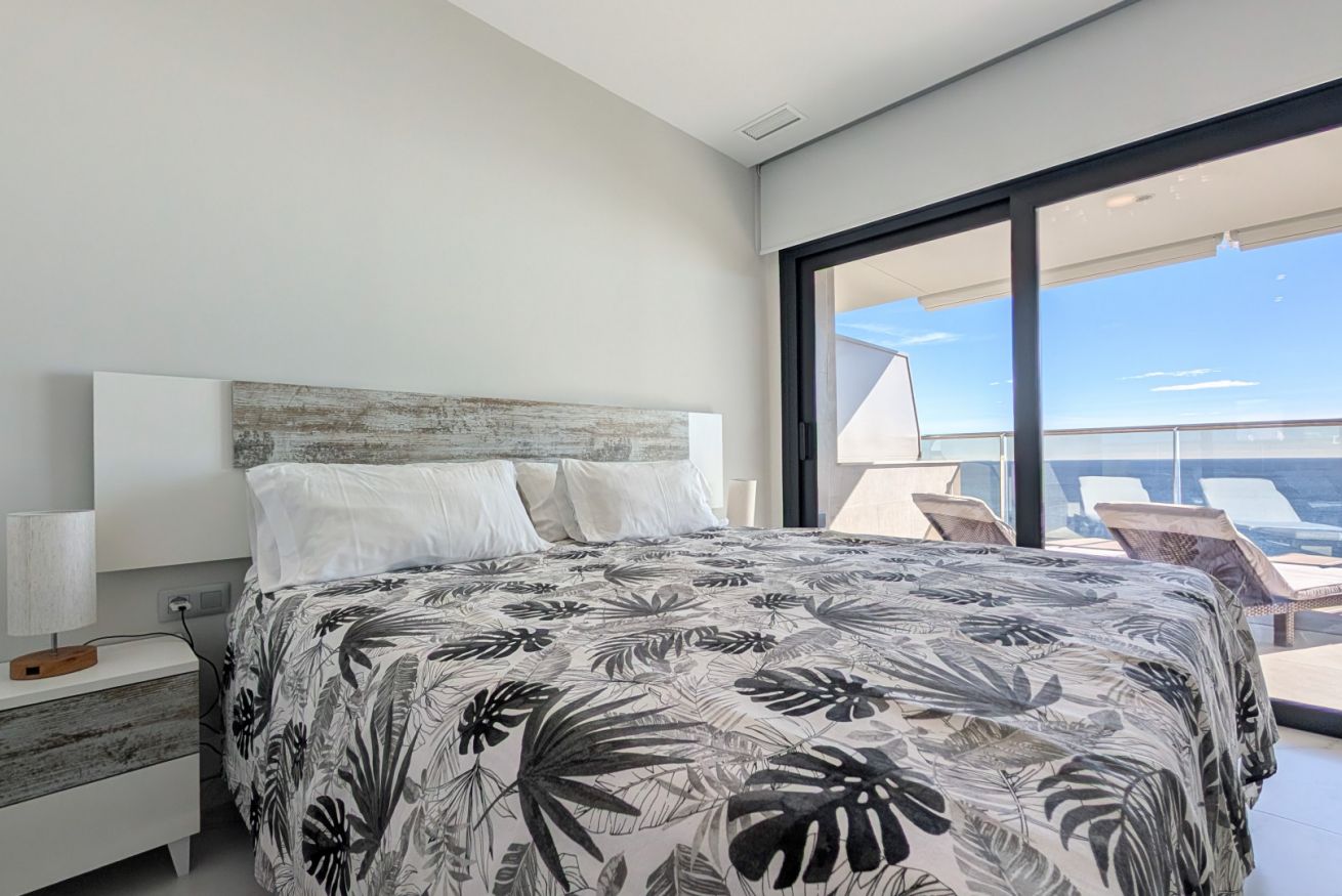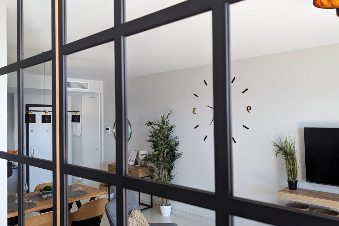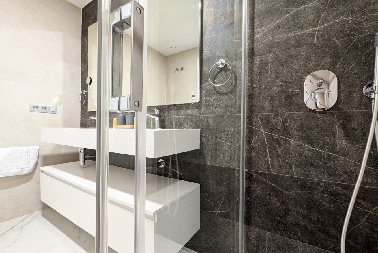 El salón es un abrazo cálido. Amplio, luminoso, con un sofá que te invita a hundirte en él y dejar que el tiempo se detenga. La Smart TV espera tus películas favoritas, mientras los ventanales de suelo a techo inundan el espacio con la luz dorada del Mediterráneo. Y justo al lado, la terraza…un balcón al paraíso, donde el mar se convierte en tu vecino y el cielo en tu techo. Desayunar aquí es como hacerlo en una postal, y cada atardecer es una pintura viva que se despliega solo para ti.