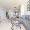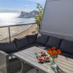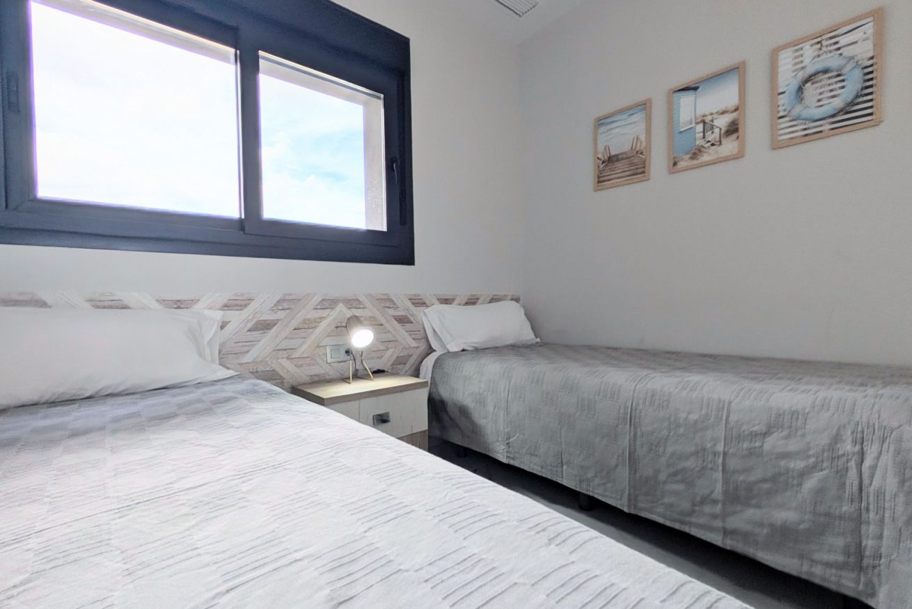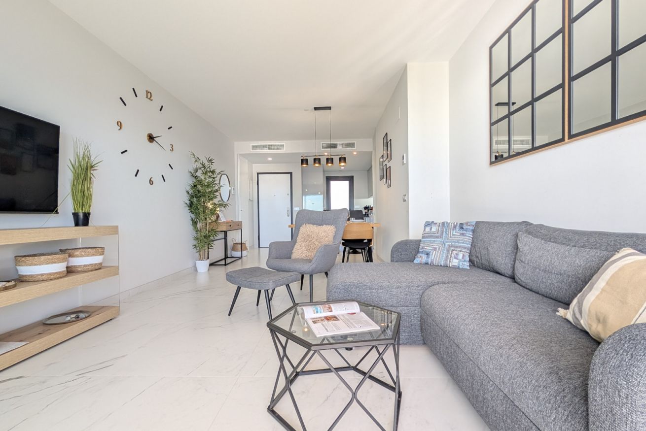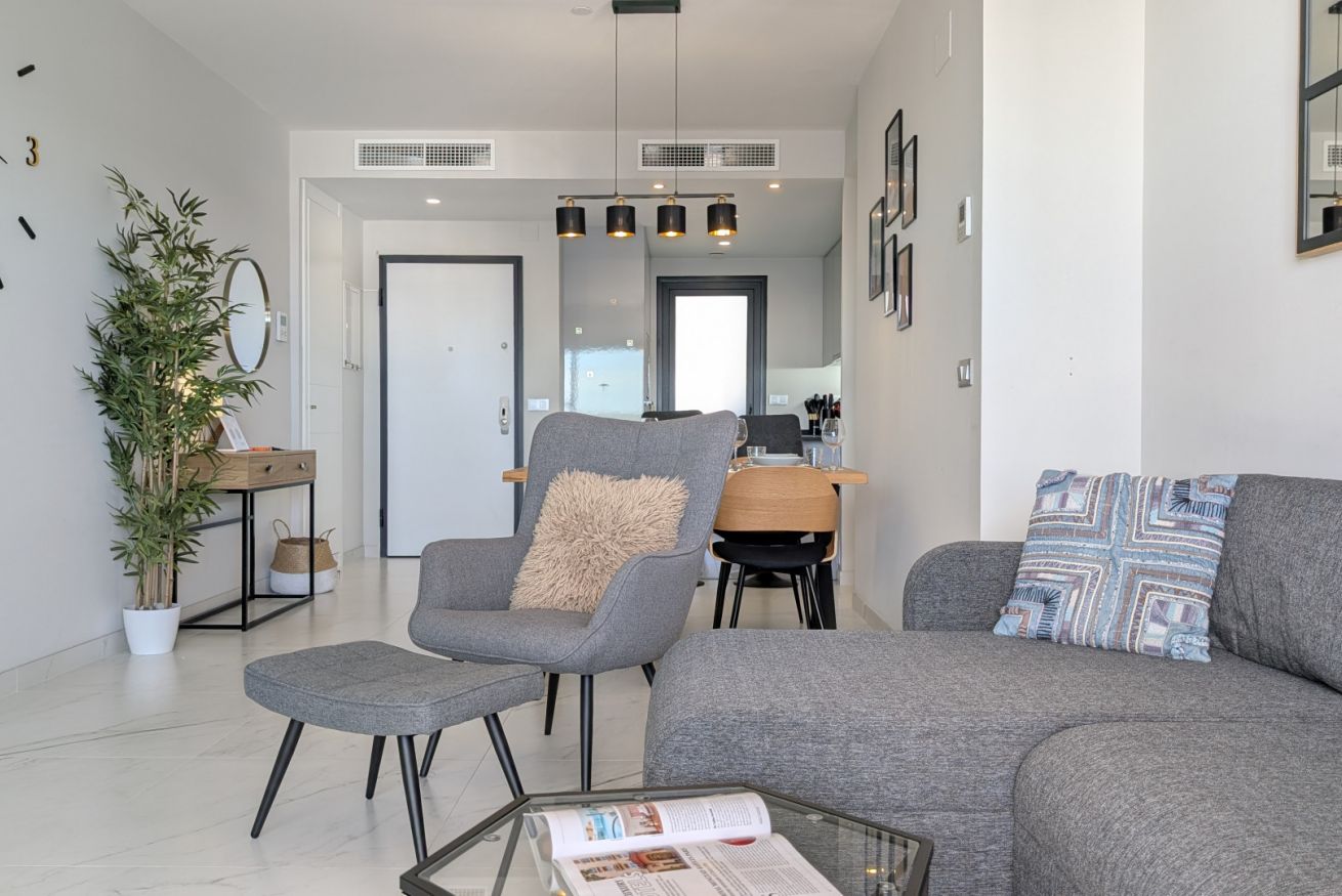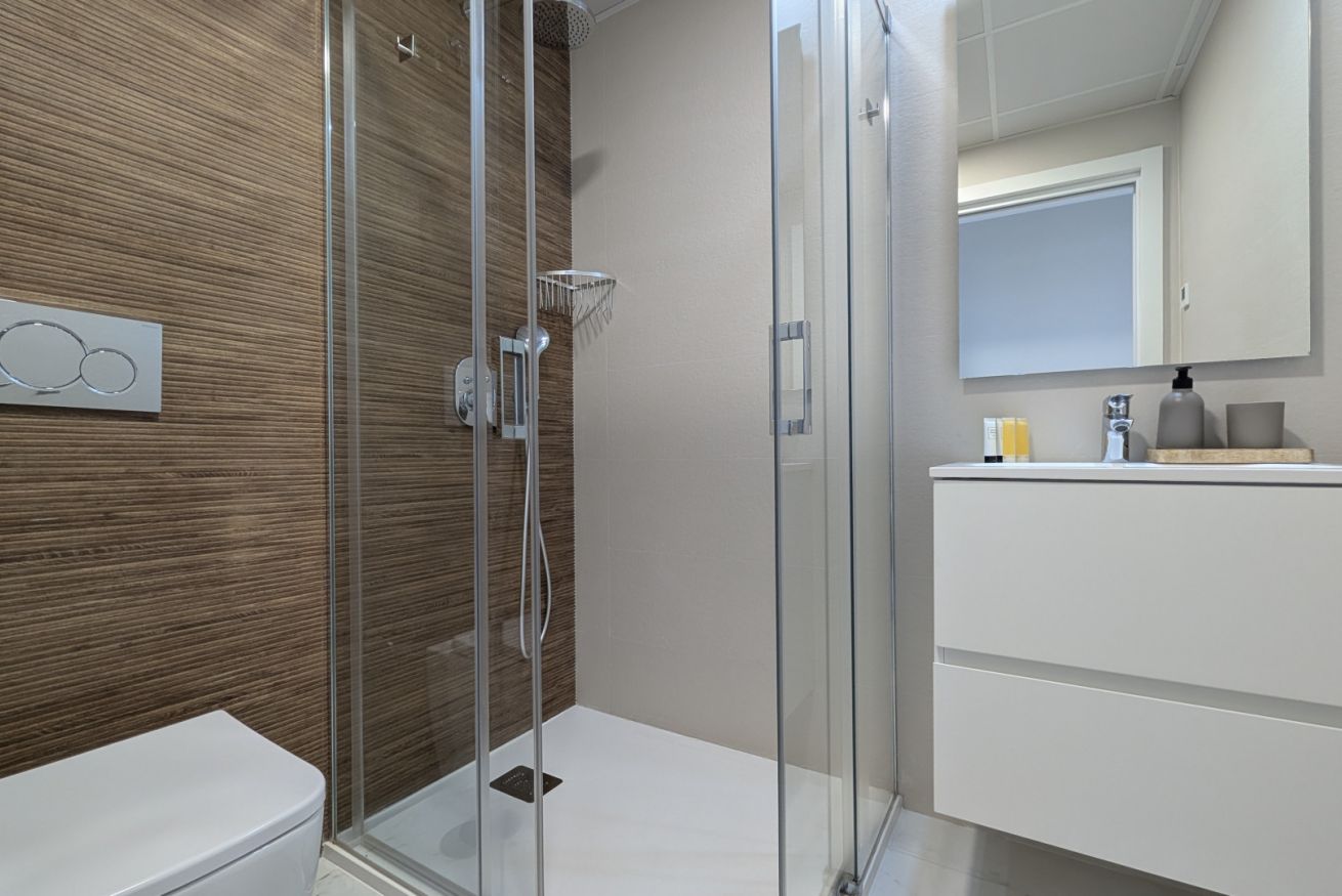 El salón es un abrazo cálido. Amplio, luminoso, con un sofá que te invita a hundirte en él y dejar que el tiempo se detenga. La Smart TV espera tus películas favoritas, mientras los ventanales de suelo a techo inundan el espacio con la luz dorada del Mediterráneo. Y justo al lado, la terraza…un balcón al paraíso, donde el mar se convierte en tu vecino y el cielo en tu techo. Desayunar aquí es como hacerlo en una postal, y cada atardecer es una pintura viva que se despliega solo para ti.