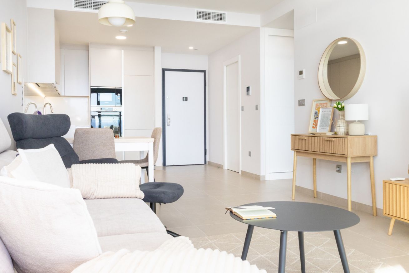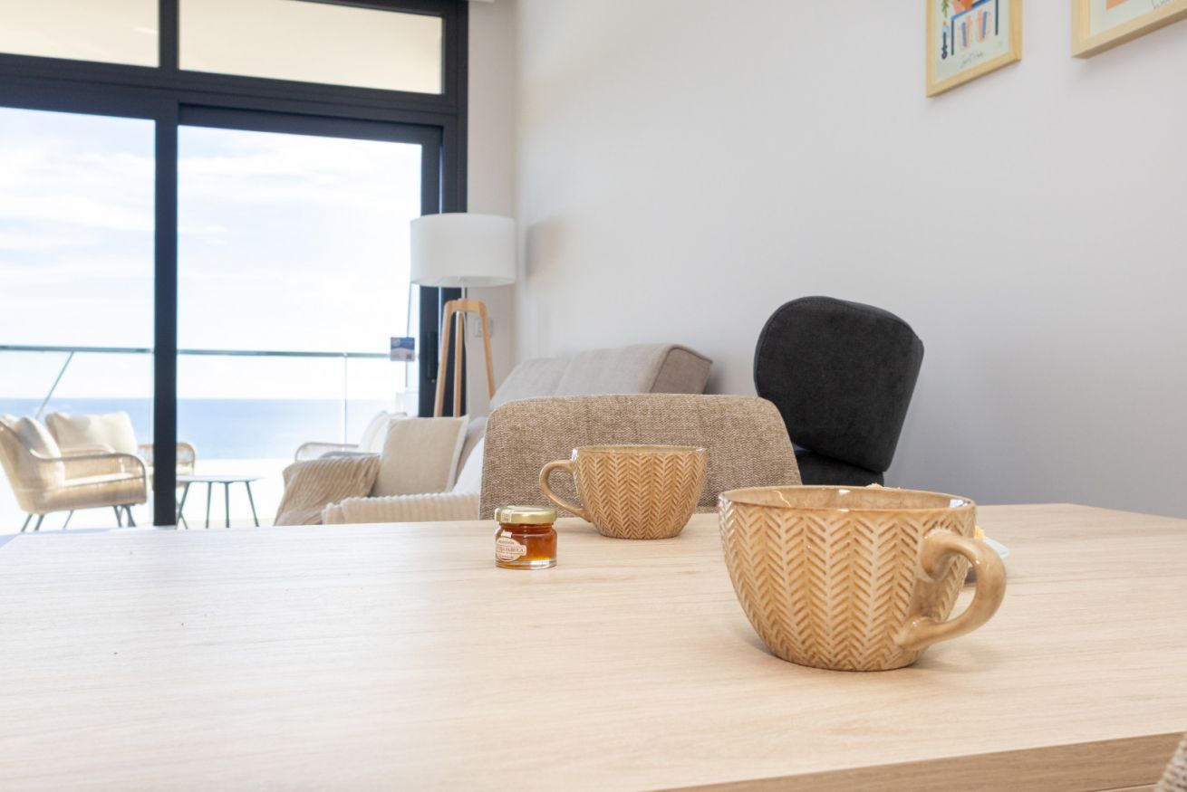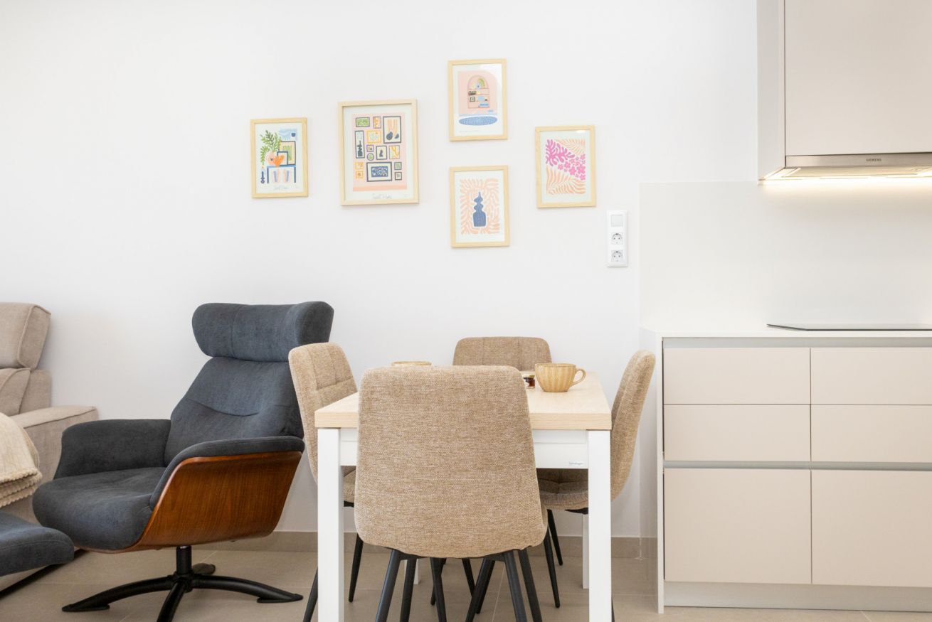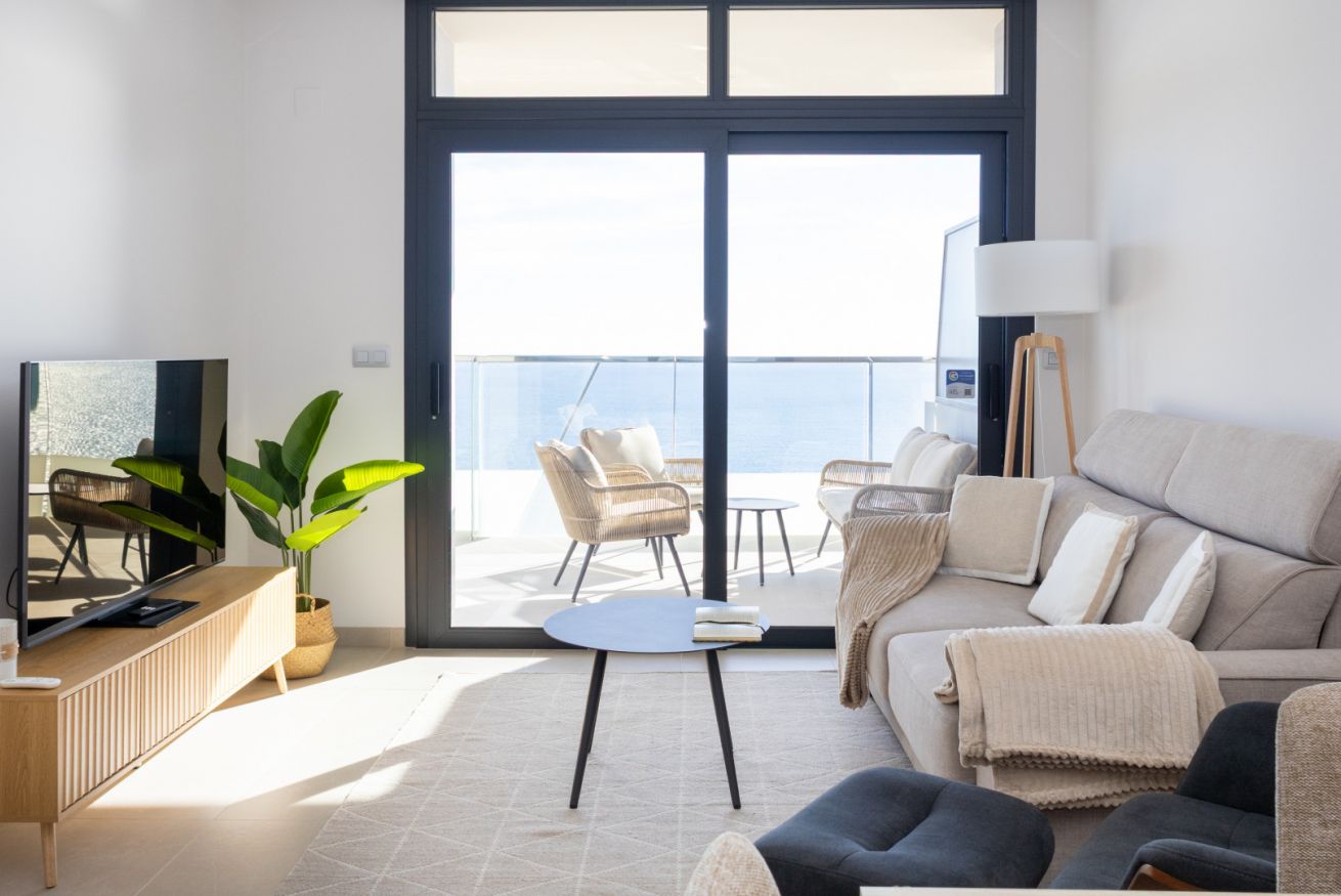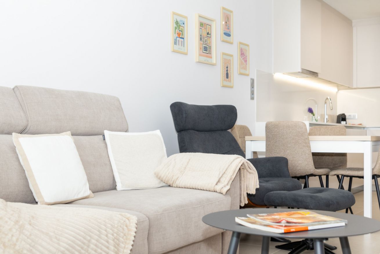 El salón es el corazón del apartamento: luminoso, abierto y decorado con gusto, invita a compartir risas, brindar con una copa de vino o simplemente dejarse llevar por la tranquilidad mientras el sol se despide en el horizonte.