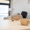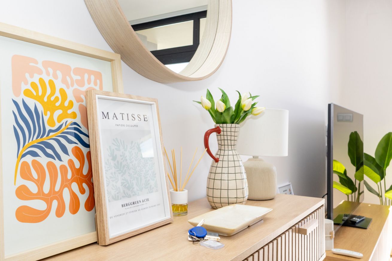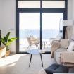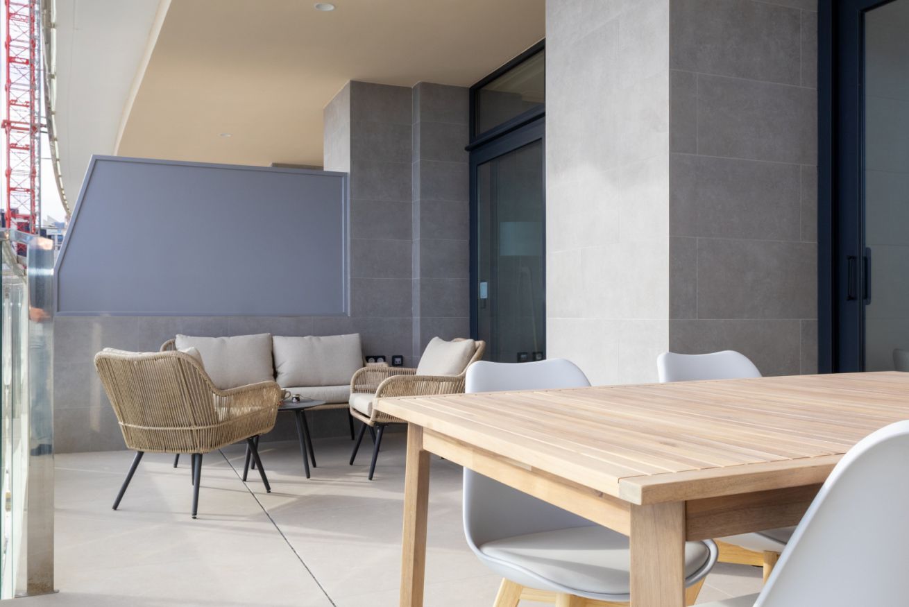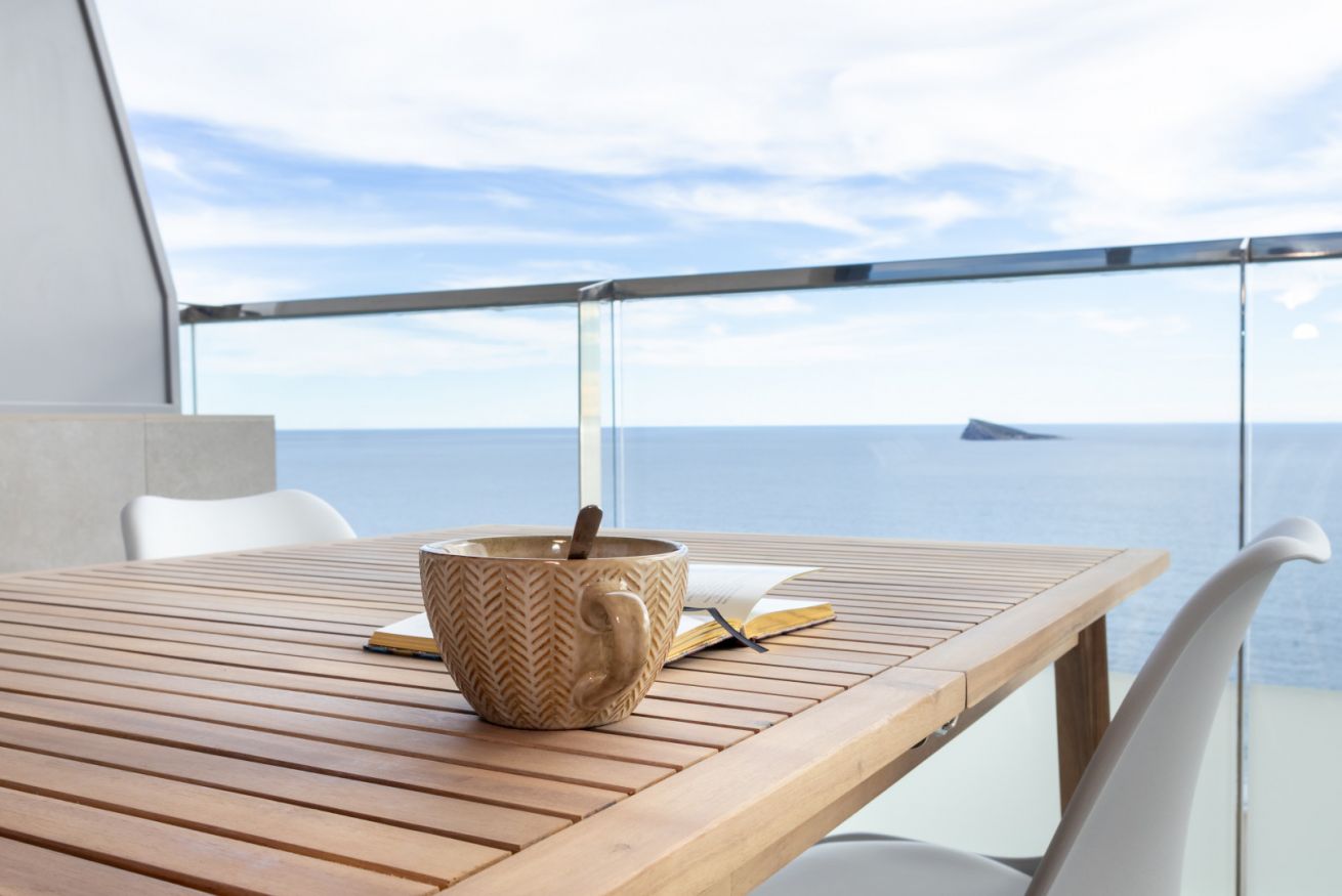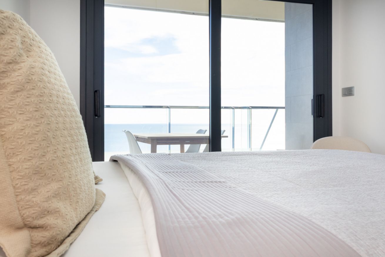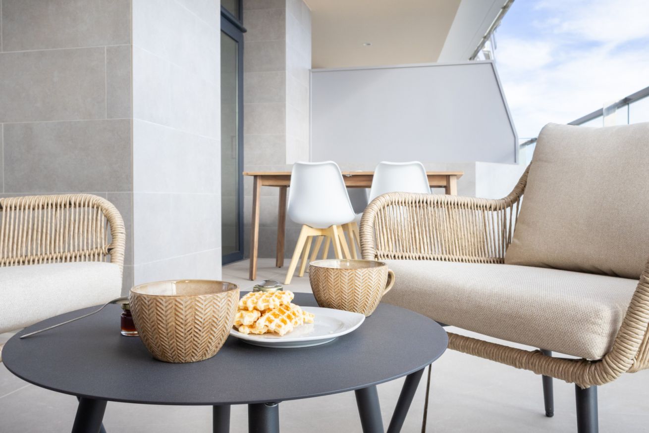 El salón es el corazón del apartamento: luminoso, abierto y decorado con gusto, invita a compartir risas, brindar con una copa de vino o simplemente dejarse llevar por la tranquilidad mientras el sol se despide en el horizonte.
