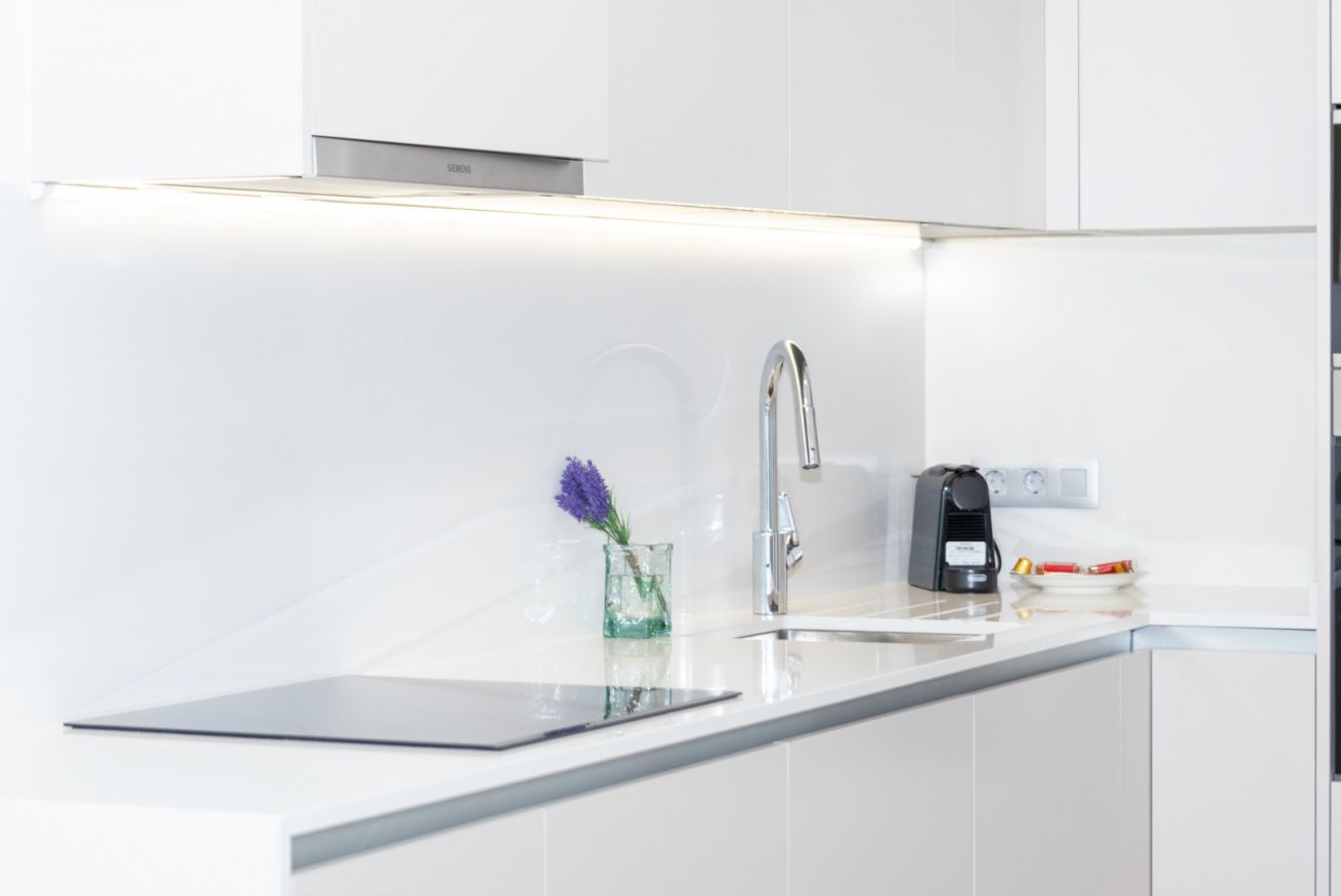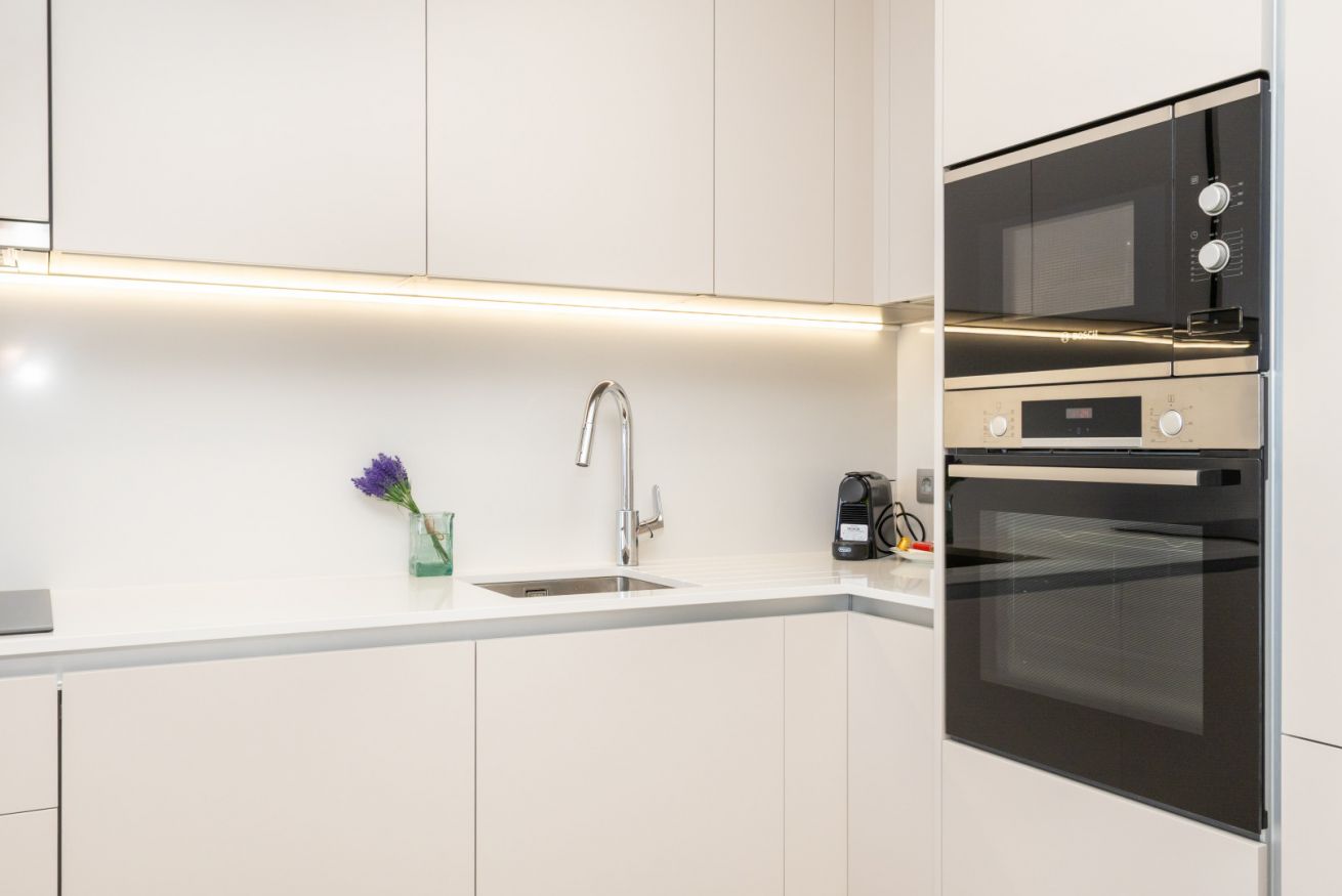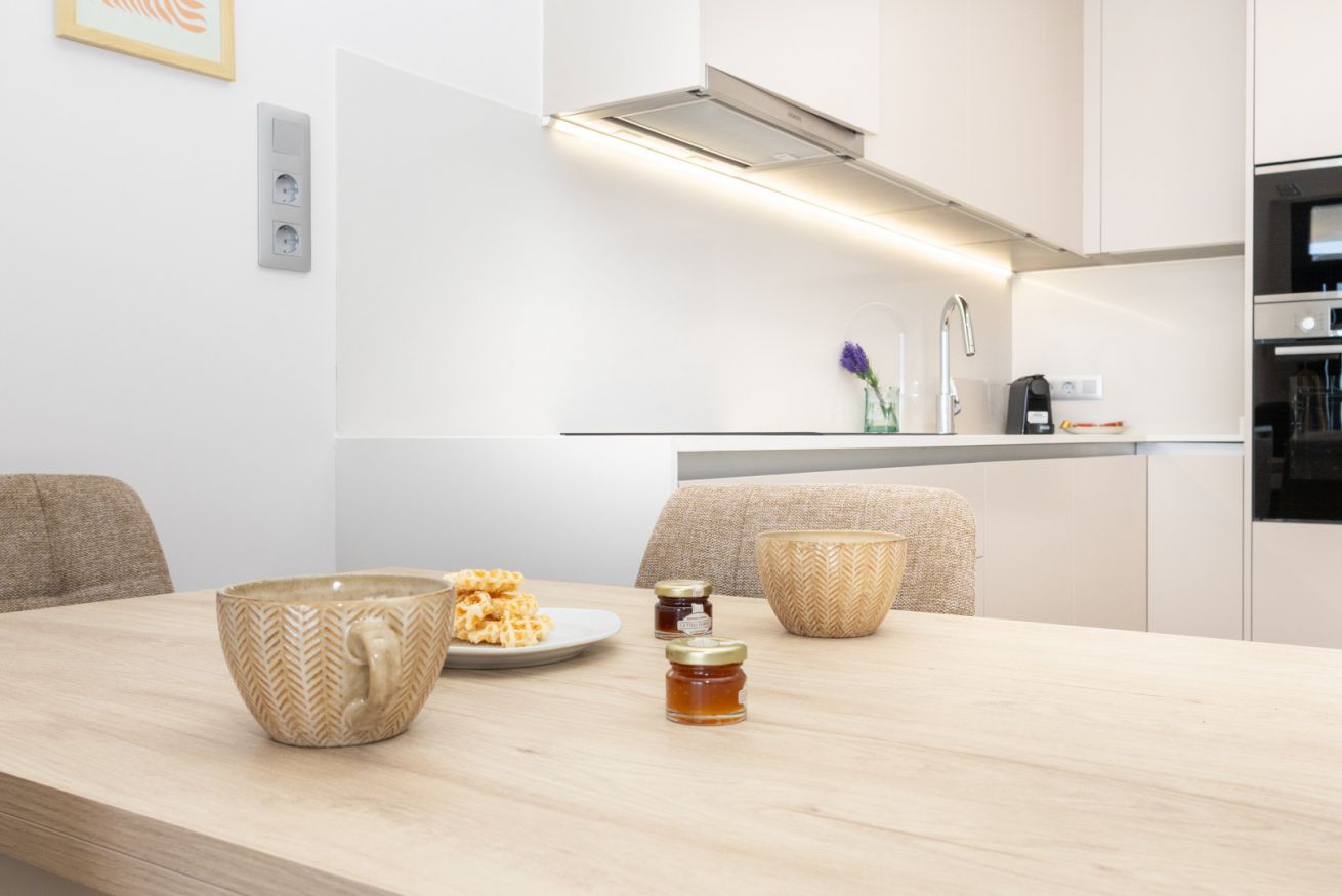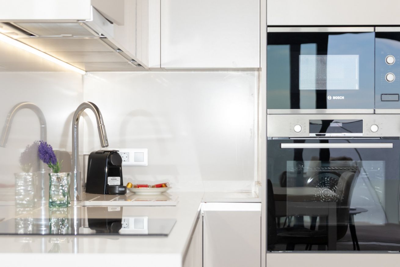 La cocina, integrada en este espacio, está equipada con todo lo que necesitas para sentirte como en casa: electrodomésticos modernos, placa de inducción, horno, microondas, cafetera y menaje completo para preparar desde un desayuno rápido hasta una cena especial. Aquí, cocinar se convierte en un placer, no en una obligación.